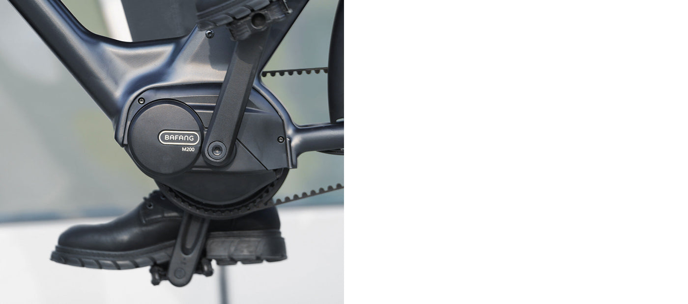 Bicicleta eléctrica urbana tipo commuter con motor central Bafang de 250W, 65 Nm de torque y diseño con tubo superior (step-over).