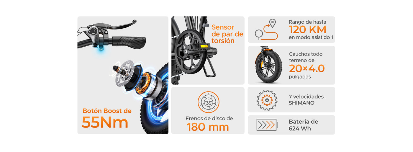 Presiona el botón Boost para un aumento instantáneo de potencia, impulsándote cuesta arriba con facilidad.